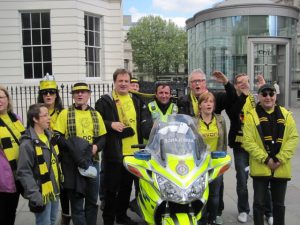 … der Bobby vor dem Championsleague-Finale 2013 in London: Auf dem Trafalgar Square trafen sich tausende BVB-Fans am Finaltag. In der englischen Öffentlichkeit herrscht in der Regel Alkoholverbot, erst recht an diesem Ort, wo sich ja die schwarzgelbe Anhängerschaft von ihrer besten Seite zeigen sollte: kein Bierverkauf, kein Alkoholverzehr am Platz. Wir hatten penibel darauf geachtet und auf dem Fußweg dorthin keinen Pub ausgelassen. Harald hatte dennoch eine Bierflasche – und fragte den Bobby, ob das so in Ordnung sei. Dieser verstand das „falsch“, kramte in seiner Hosentasche, zog einen Flaschenöffner heraus, öffnete unserem verdutzten Geschäftsführer die Bierflasche und wünschte ein super Spiel. Soviel zum Alkoholverbot auf dem Trafalgar Square und die Einsatztaktik der Londoner Ordnungshüter …